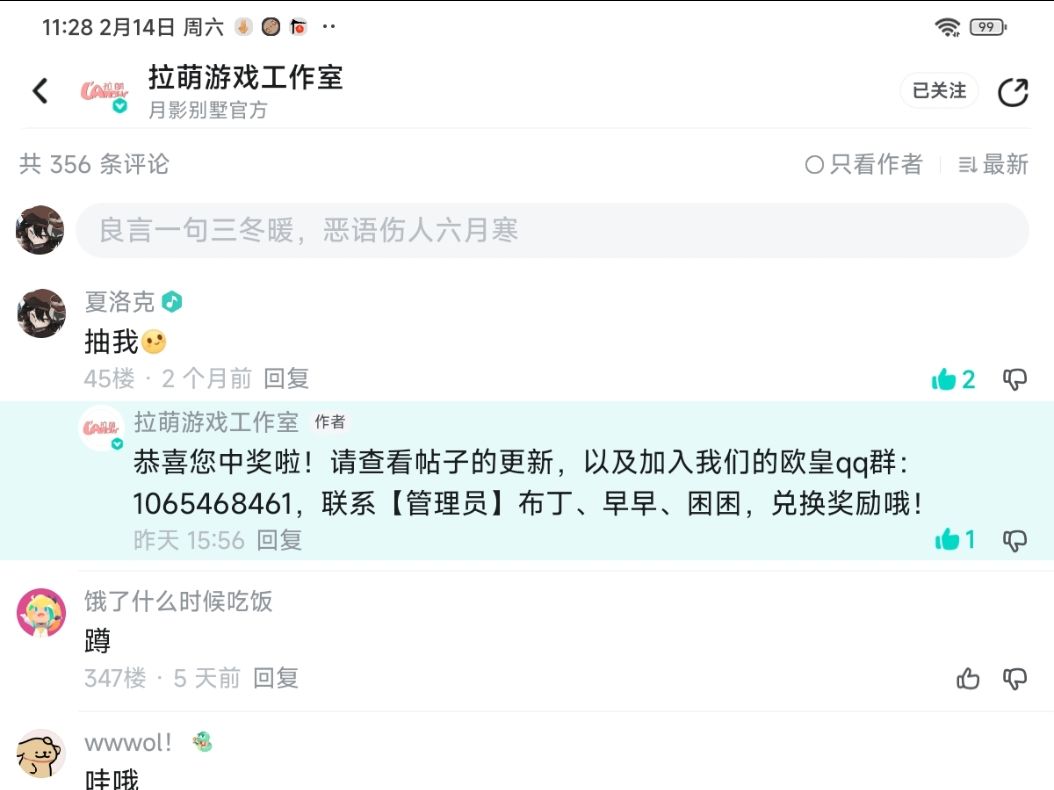 感谢各位血猎大人参与一周年问卷调研!50000约兰币兑换码奉上: 9GHQB24D 有效期一周,请各位血猎大人及时兑换哦❤ 月影别墅基地: 官方14群:556054029 攻略剧情4群:123360090 (攻略剧情群只能讨论月影别墅相关,不闲聊) 微博:月影别墅 B站:月影别墅 公众号:拉萌工作室