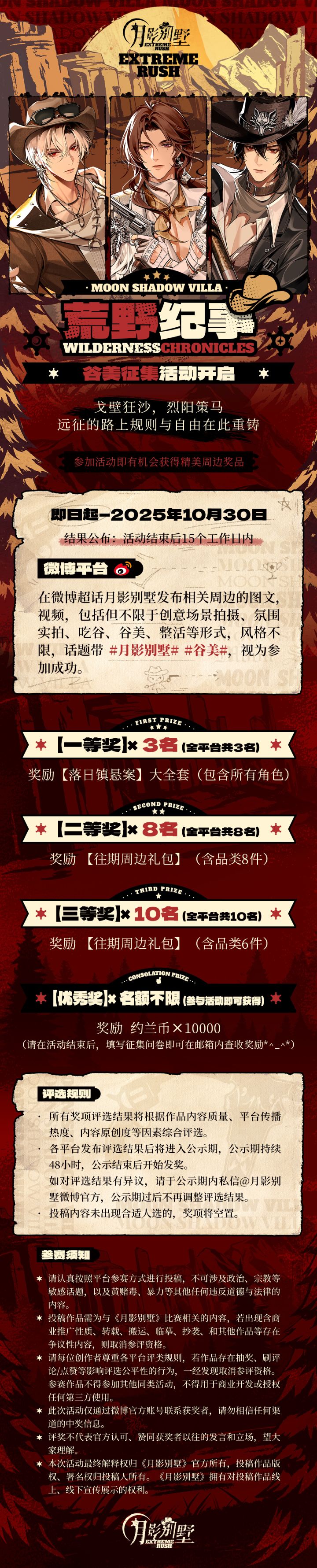 【月影别墅】荒野纪事谷美征集活动开启!🔨荒野纪事🔨谷美展示征集活动开启!期待各位血猎大人的作品📸🐎戈壁狂沙,烈阳策马,远征的路上规则与自由在此重铸。❤️活动时间即日起—2025年10月30日*征集内容*发布关于月影别墅相关周边的图文,视频,包括但不限于创意场景拍摄、氛围实拍、吃谷、谷美、整活等形式,风格不限,话题带#月影别墅# #谷美#,视为参加成功。*活动奖励*参与活动即可获得1