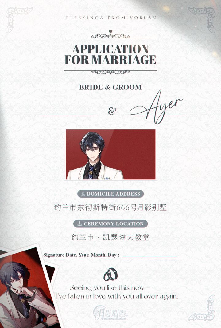 以爱之名,余生为期,晨昏相依,挚爱永恒。大人可自行取用婚书哦❤血猎活动中心:官方28群:456835818微博:月影别墅B站:月影别墅公众号:拉萌工作室抖音:月影别墅