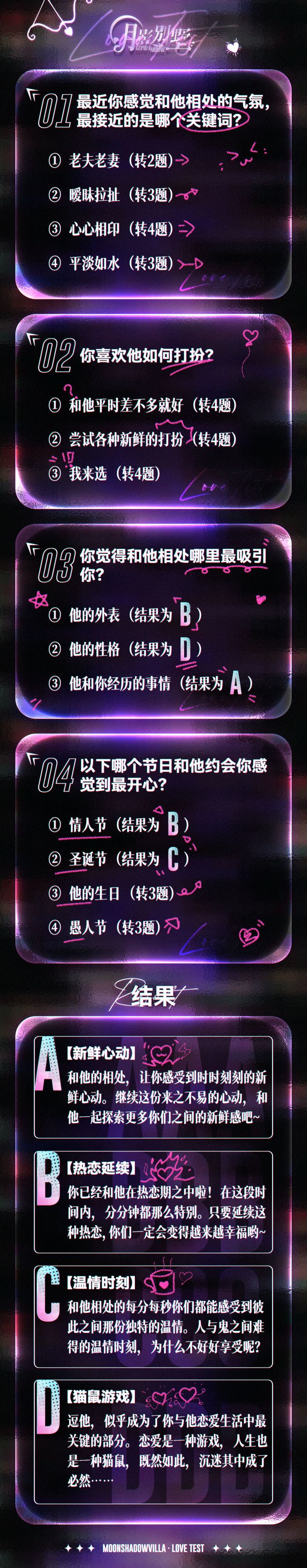 【小别墅的爱情测试时间】 快来测测你和他现在的状态吧:)血猎活动中心:官方29群:683684114微博:月影别墅B站:月影别墅公众号:拉萌工作室抖音:月影别墅