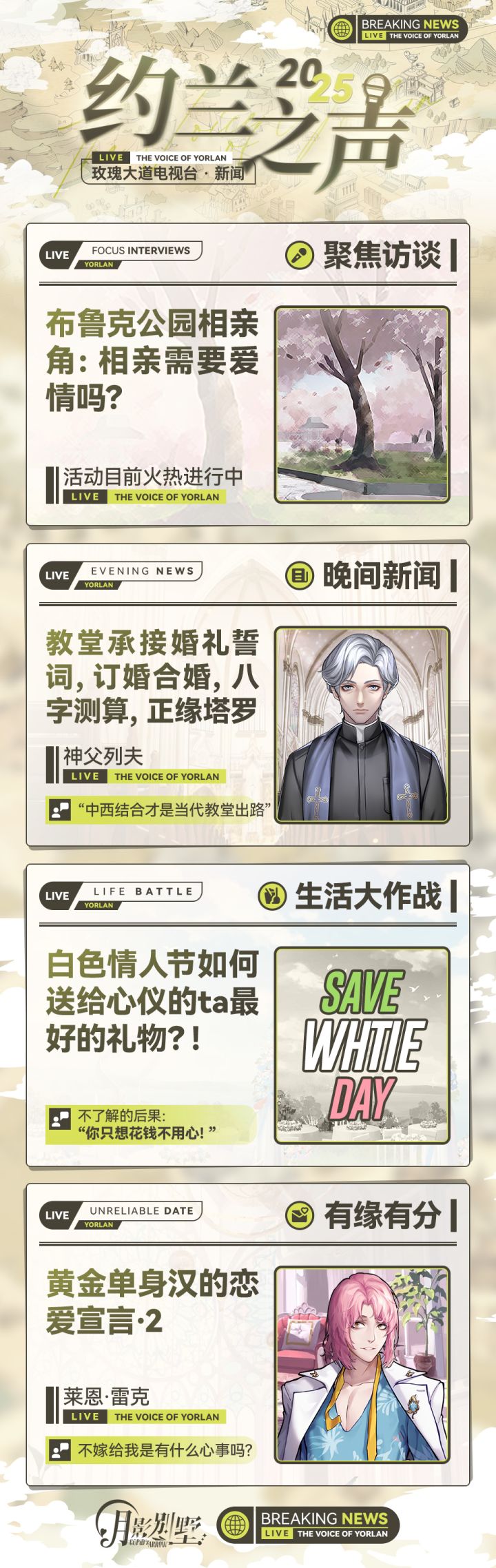 【约兰之声节目预告】 玫瑰大道电视台为您带来约兰之声·约会地点特别节目。 各位约兰居民们,白色情人节将至,您将与心仪的ta前往哪里度过呢? 聚焦访谈、晚间新闻、生活大作战、有缘有分……在节目中寻找那个答案吧! 请在下方评论区为我们留言吧↓血猎活动中心:官方28群:456835818微博:月影别墅B站:月影别墅公众号:拉萌工作室抖音:月影别墅