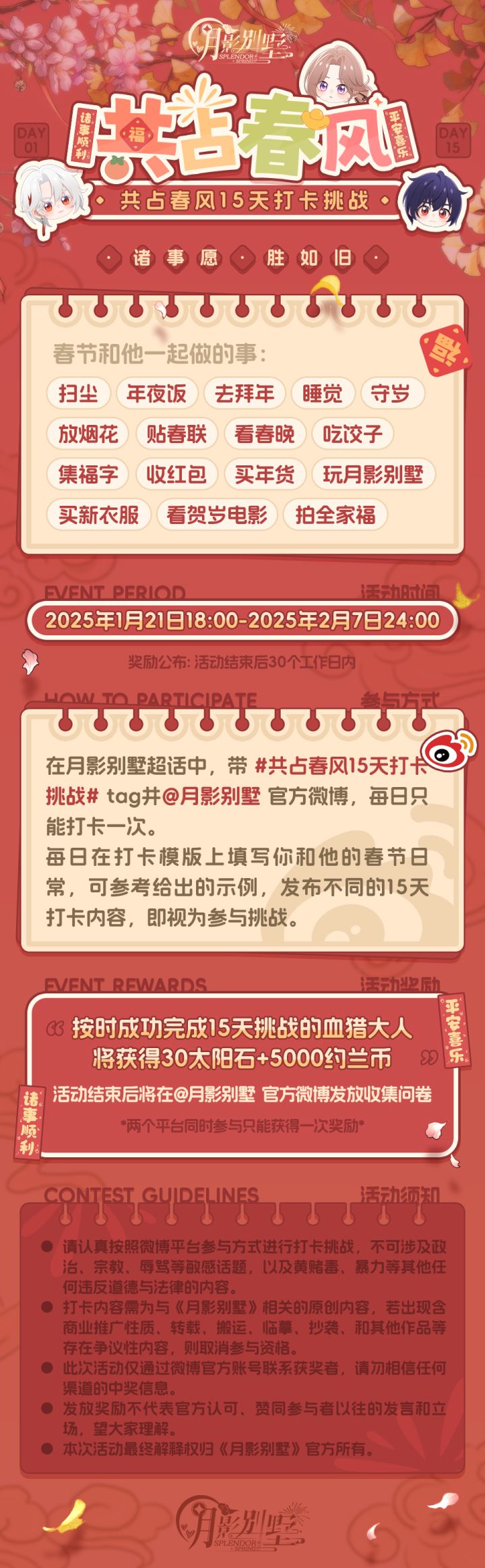 ✨共占春风·15天打卡挑战活动——现在开启! 🎉活动时间:2025年1月21日18:00-2025年2月7日24:00欢迎血猎大人使用便利贴模板发布你的打卡日常💕~诸事愿,胜如旧。🎁参与打卡活动有机会获得太阳石等游戏道具哦,期待各位血猎大人的热情参与!活动详情请看下方长图↓血猎活动中心:官方14群:556054029微博:月影别墅B站:月影别墅公众号:拉萌工作室抖音:月影别墅