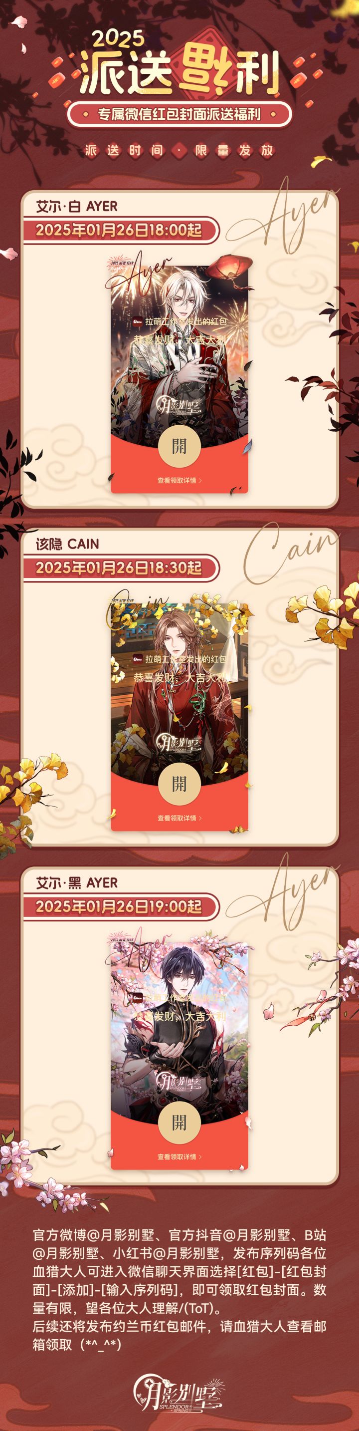 ⭐2025年《月影别墅》新春限定红包封面发放预告:► 发放时间【1月26日18:00公布 白艾尔封面序列码】【1月26日18:30公布 该隐封面序列码】【1月26日19:00公布 黑艾尔封面序列码】► 发放方式 官方账号定时公布序列码【小别墅的特别提示】血猎大人进入聊天界面选择-[红包封面]-[添加]-[输入序列码],即可领取红包封面。在公众号后台发序列码无法领取红包封面,还请血猎
