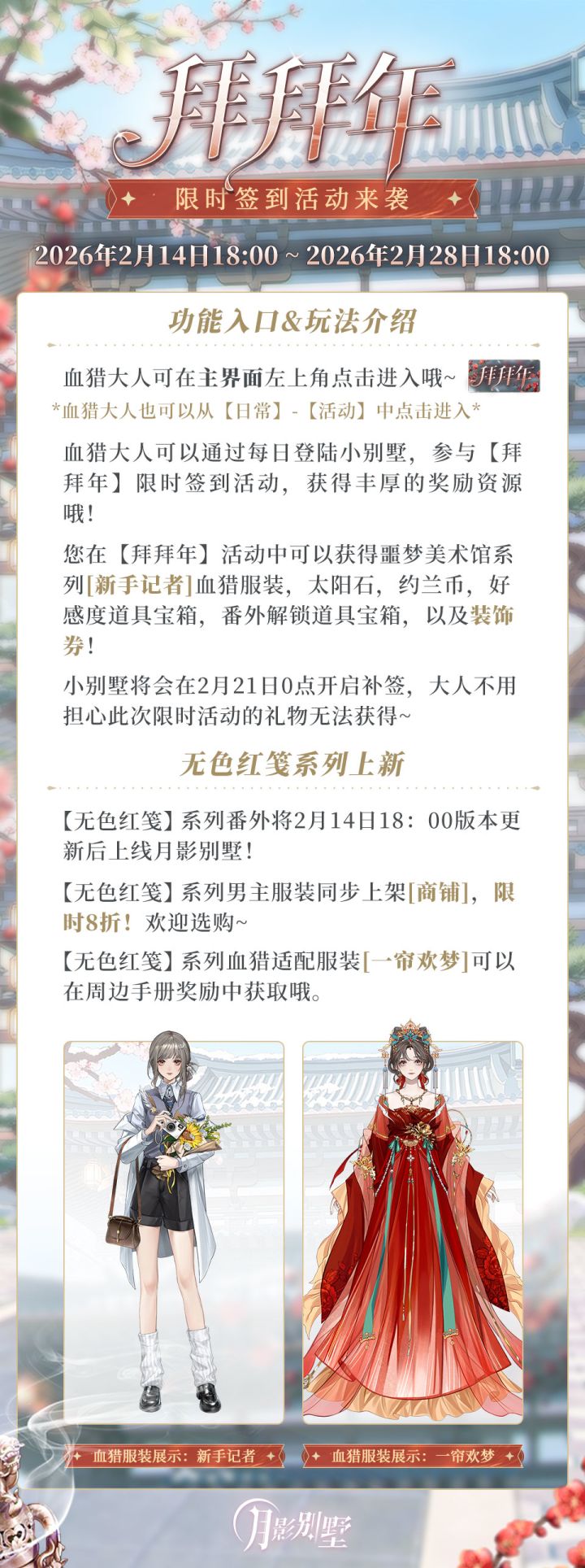 [小别墅的活动说明时间]【拜拜年】活动详细内容大人请看图片~血猎活动中心:月影别墅官方12群:130501024微博:月影别墅B站:月影别墅公众号:拉萌工作室抖音:月影别墅