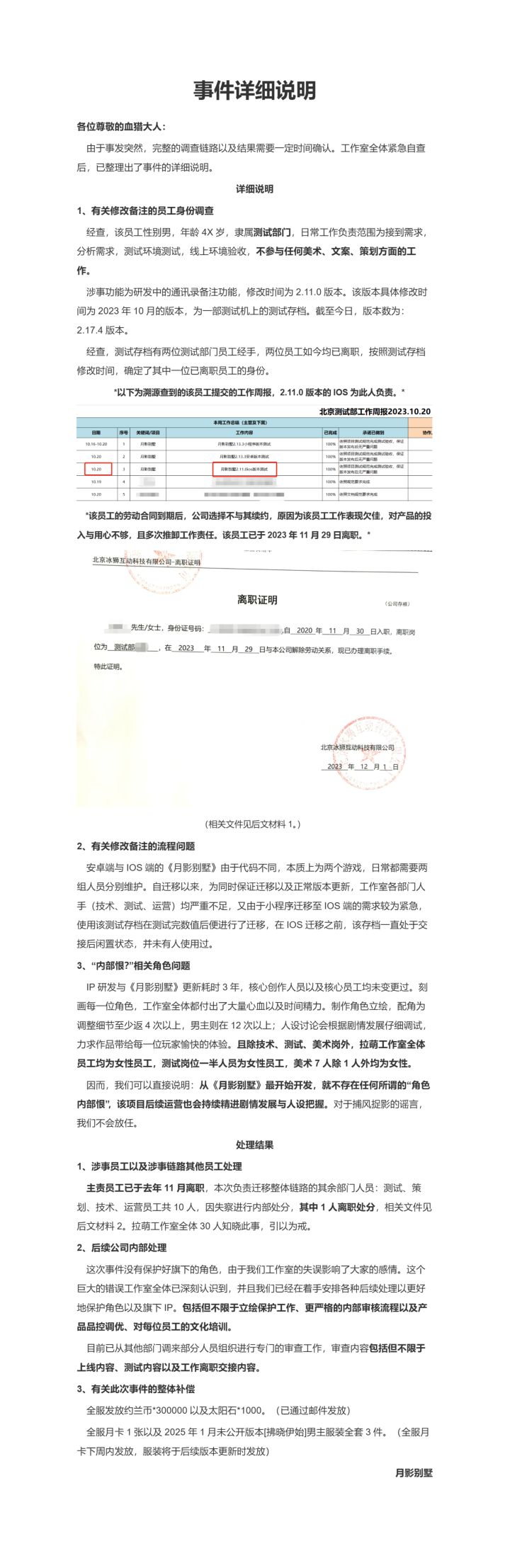 有关事件的进一步详细说明来了,请查看。详细说明见P1,文件材料1见P2,文件材料2见P3。再次为给大家造成的困扰而诚挚道歉,我们仍在持续优化与自我鞭策的路上。感谢所有玩家的支持和理解。