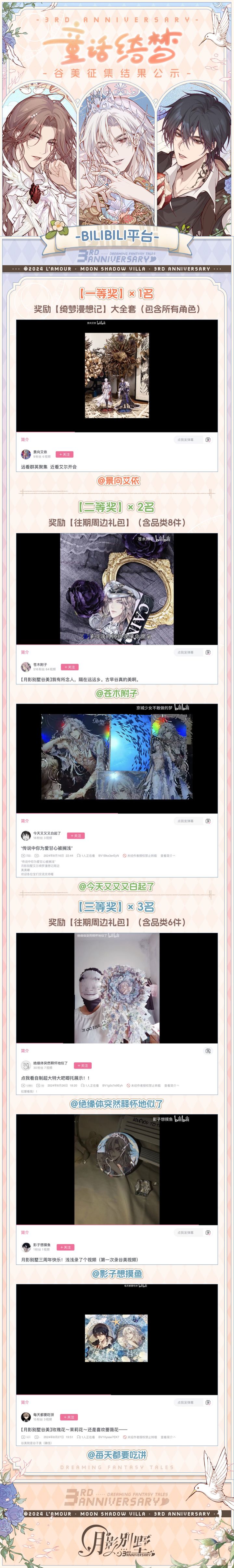 🪽童话绮梦🪽谷美征集活动正式结束!感谢每一位参与活动的血猎大人! 🎁请入选的血猎大人带作品链接私信对应的官方账号,提供收货地址领取奖品!【特别提示】(B站请私信B站@月影别墅 | 小红书请私信小红书@月影别墅 | 微博请私信官方微博@月影别墅 )❤️2024年8月16日-2024年10月8日活动期内,参与活动的血猎大人请填写下方征集问卷,即可在邮箱内领取10000约兰币奖励!征集问卷截止
