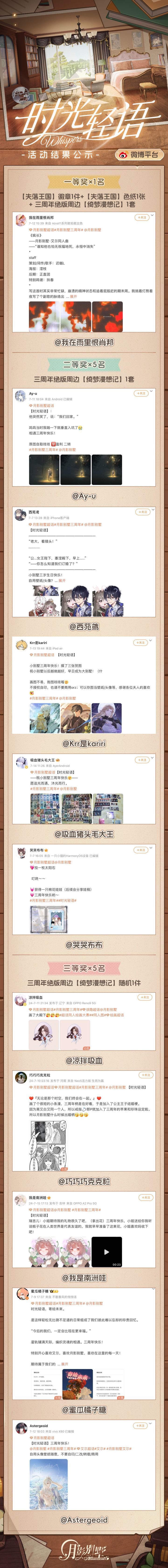 【月影别墅】时光轻语三周年征集结果公布,各位血猎大人可点击下方长图查看。 *排名不分先后 请名单上的血猎大人带作品链接私信对应官方账号,提供收货地址领取奖品~【特别提示】(B站请私信B站@月影别墅 | 小红书请私信小红书@月影别墅 | 微博请私信官方微博@月影别墅 | 抖音请私信官方抖音@月影别墅)征集结果详情,请见下方长图↓血猎活动中心:官方9群:539832972微博:月影别墅