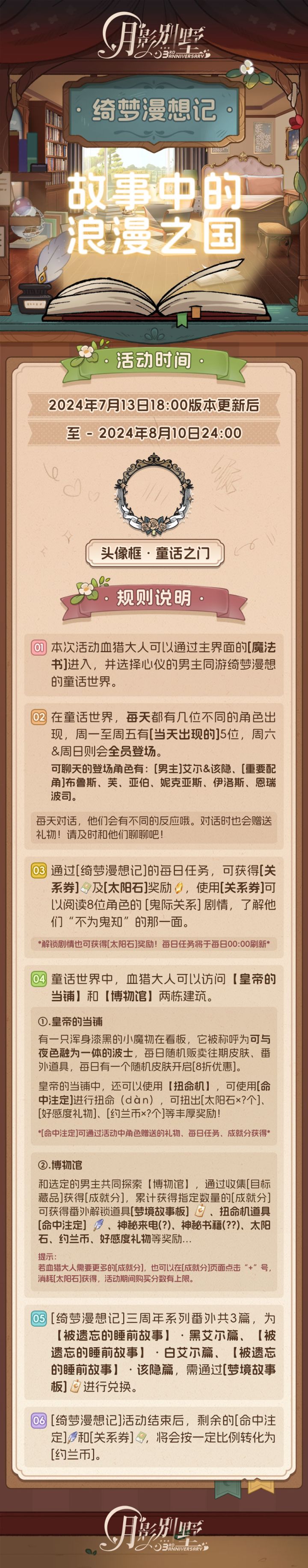 绮梦漫想记·故事中的浪漫之国~ 三周年专属活动即将启动!具体内容请看长图~↓血猎活动中心:官方9群:539832972微博:月影别墅B站:月影别墅公众号:拉萌工作室抖音:月影别墅