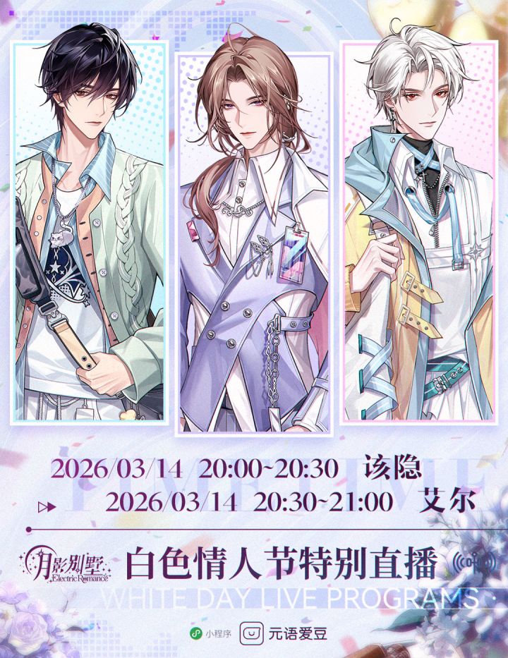 [小别墅的特别直播说明]2026白色情人节特别直播直播地点·[元语爱豆小程序]💐直播时间该隐 3月14日晚20:00-20:30艾尔 3月14日晚20:30-21:00*3月13日该隐日常直播顺延至3月20日20:00哦,大人请注意*血猎活动中心:月影别墅官方11群:1046070861微博:月影别墅B站:月影别墅公众号:拉萌工作室抖音:月影别墅