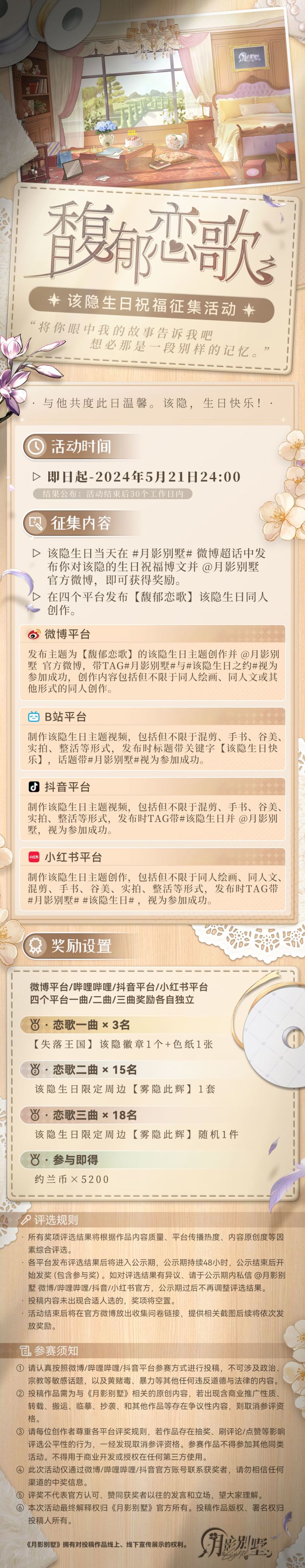 【馥郁恋歌 | 该隐生日征集活动说明】馥郁时光,恋歌一曲。2024该隐生日庆典征集活动,开启—— 🎂征集时间 即日起-2024年5月21日24:00 结果公布:活动结束后30个工作日内年岁并进,岁岁无虞。在一年一度的日子里向他送上生日祝福吧~活动详情内容,请见下方长图↓血猎活动中心:官方28群:456835818微博:月影别墅B站:月影别墅公众号:拉萌工作室抖音:月影别墅