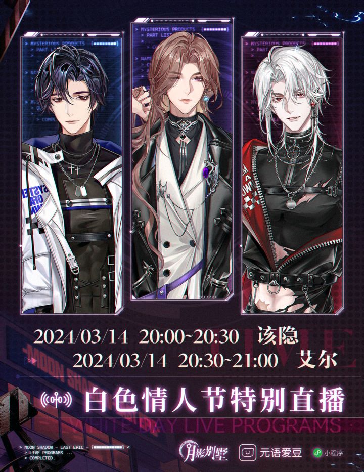 【小别墅的特别直播说明】❤白色情人节特别直播直播地点·[元语爱豆小程序]❤直播时间该隐 3月14日晚20:00-20:30艾尔 3月14日晚20:30-21:00血猎活动中心:官方12群:130501024 微博:月影别墅B站:月影别墅公众号:拉萌工作室抖音:月影别墅