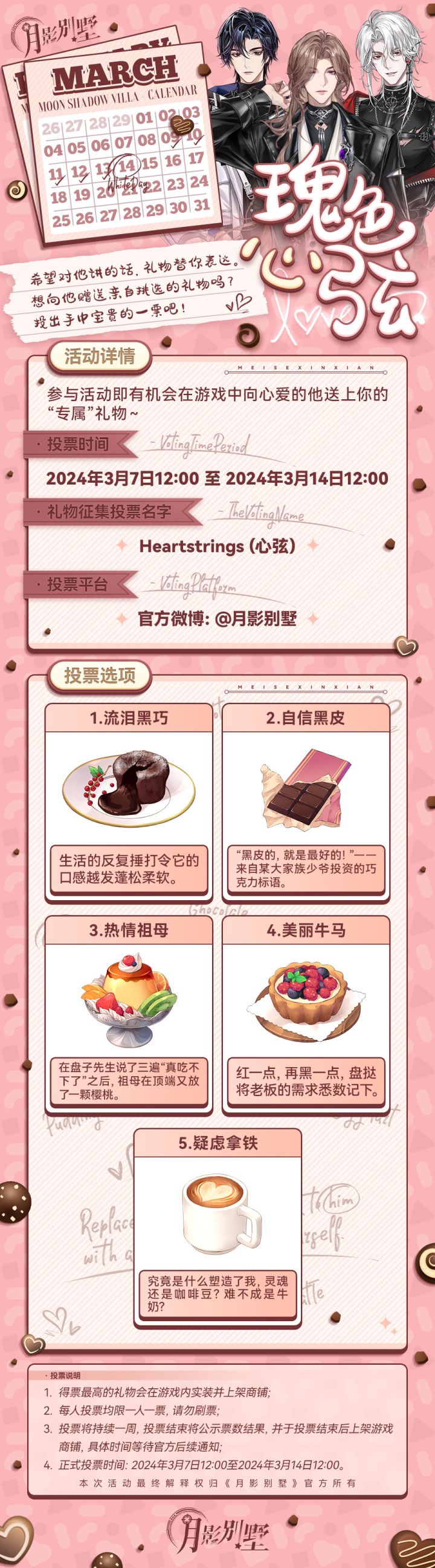 甜蜜滋味,触动心弦。🌹heartstrings 🌹特殊赠礼投票活动正式开启~【小别墅的活动说明】 各位血猎大人投出手中宝贵的一票,五位参赛选手中的一位将有机会成为赋予深意的美味馈赠,作为好感度道具上架游戏商铺。*投票方式:在本帖评论区,回复心仪选项的序号*活动详情内容,请见下方长图↓血猎活动中心:官方28群:456835818微博:月影别墅B站:月影别墅公众号:拉萌工作室抖