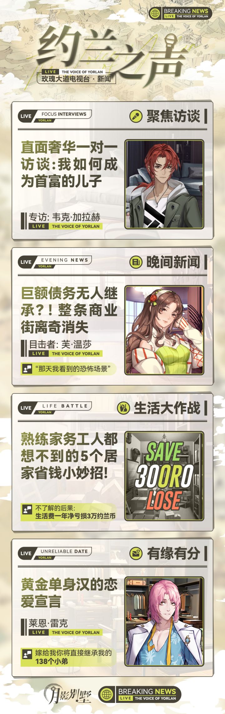 【约兰之声节目预告】 玫瑰大道电视台为您带来约兰之声·您的新闻早间预告。 各位约兰居民们,您打开电视的每一次选择,将决定所有节目的生死。 聚焦访谈、晚间新闻、生活大作战、有缘有分……您最期待的节目会是哪一个呢? 请在下方评论区为我们留言吧↓血猎活动中心:官方28群:456835818微博:月影别墅B站:月影别墅公众号:拉萌工作室抖音:月影别墅