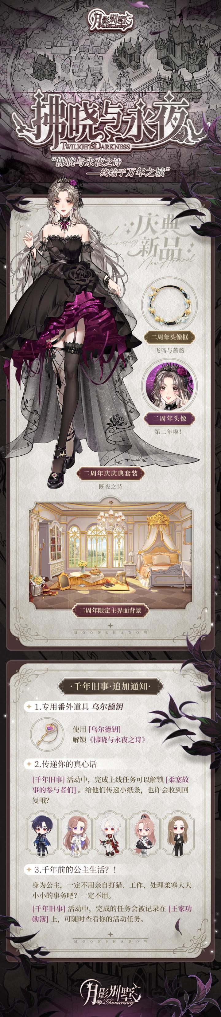 “拂晓与永夜之诗——启程自千年以前。” 第一部分的庆典情报&活动内容见下方长图。 全新活动装扮、任务故事与番外剧情,从今天开始做公主吧! 还未公开的其他套装与限定头像框:欲知后事如何,请待下回分解。月影别墅基地:官方22群:810248639微博:月影别墅B站:月影别墅公众号:拉萌工作室抖音:月影别墅