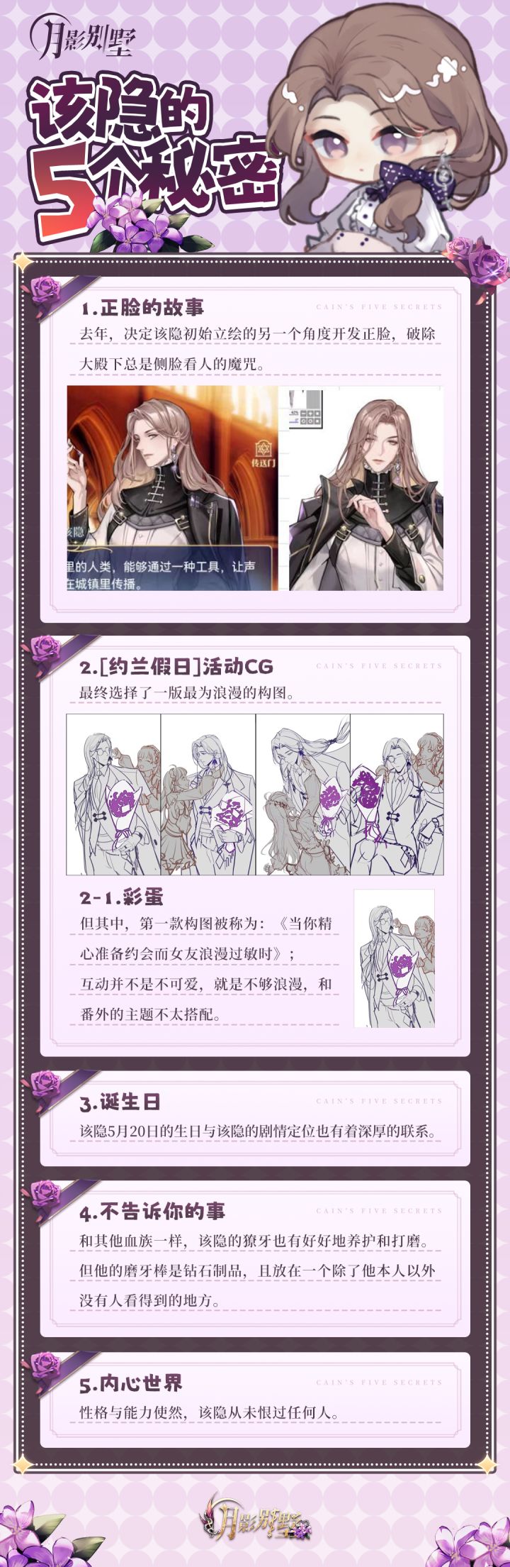 【小别墅的聊天室】·该隐的五个秘密! 关于神秘的该隐·亚特殿下~最独特的五个秘密~ 哪一件令你有着额外的猜想与感受呢?请在评论区分享吧!【5月20日将抽取在本聊天室下发布猜想与感受评论的1位幸运血猎大人送出薄夜之倾该隐生日限定周边1件】月影别墅基地:官方21群:789820192微博:月影别墅B站:月影别墅公众号:拉萌工作室抖音:月影别墅 ===================