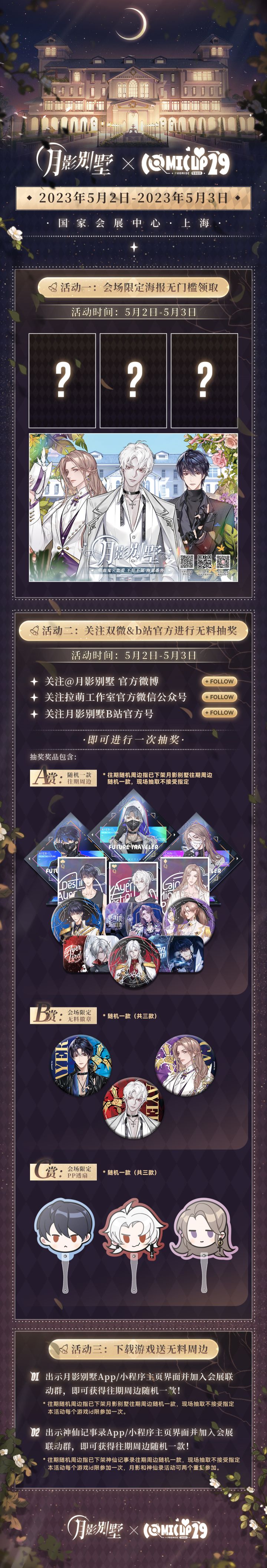 前世与今生,你会如何选择?✚Comicup29 · 参展说明✚【活动Ⅰ】✡现场无料海报派送✡~为前往的血猎大人准备了无料海报(共4款),无门槛不限量领取~【活动Ⅱ】✡会场限定无料周边抽取✡ 会场现场关注官方微博@月影别墅 B站@月影别墅 官方公众号@拉萌工作室 ,即可获得一次无料周边抽取机会。【活动Ⅲ】✡下载即得无料周边✡ 出示【月影别墅】或【神仙记事录】主页界面(APP与小程