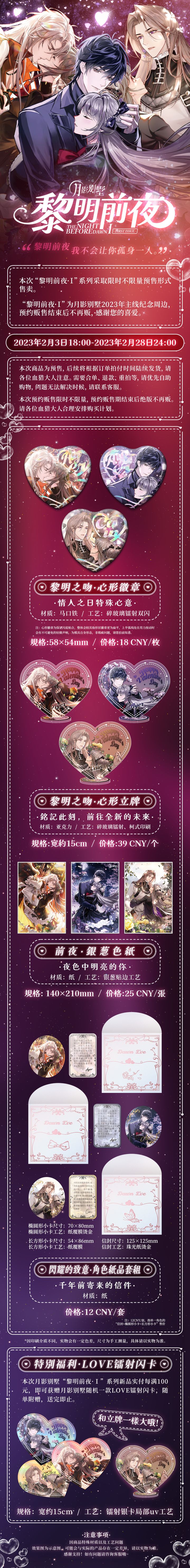 黎明前夜·Ⅰ 主线剧情&情人节周边情报公开⭐黎明前夜Ⅰ·主线纪念限定绝版周边⭐ 详细情报↓㋁㏢㍪: 新品心形吧唧&新品心形立牌&银葱包边色纸&定制纸品套组&附赠镭射闪卡限时贩售过后不再贩,官方淘宝搜索拉萌工作室、微信有赞商城搜索拉萌工作室,还有VIP积分相赠㊒更多周边详细情报,请咨询官店客服。【特别说明】:[黎明前夜]相关主线剧情纪念周边分Ⅰ、Ⅱ期,Ⅱ期周边敬请期待后续情报公告!月影
