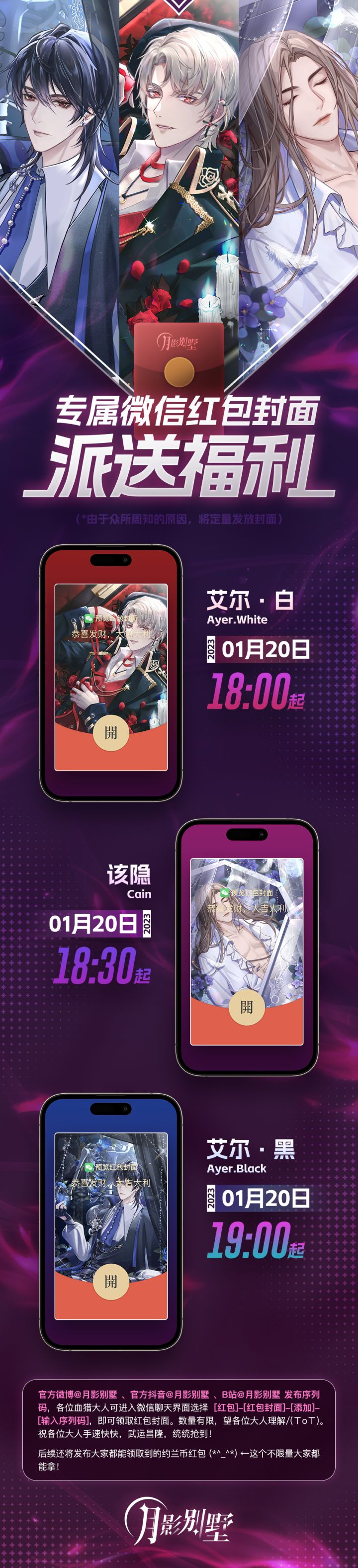 「吉祥如意庆新喜,百福齐聚贺新春」 ⭐2023年《月影别墅》新春限定红包封面发放预告: ► 发放时间【1月20日18:00公布 白艾尔封面序列码】【1月20日18:30公布 该隐封面序列码】【1月20日19:00公布 黑艾尔封面序列码】详细内容请看长图↓↓↓ 月影别墅基地:官方17群:744247417微博:月影别墅抖音:月影别墅公众号:拉萌工作室