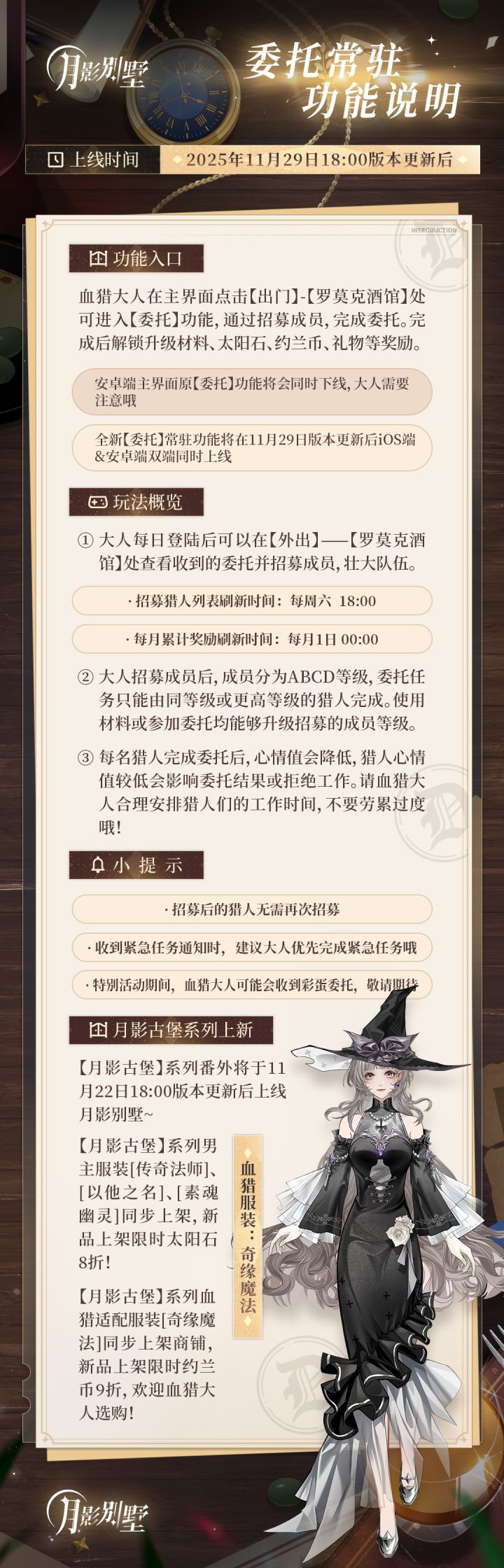 [小别墅的常驻功能说明]委托功能全新升级!血猎大人快来培养猎人伙伴,一起保护您的城市!详细说明大人请看图片~血猎活动中心:官方22群:810248639微博:月影别墅B站:月影别墅公众号:拉萌工作室抖音:月影别墅