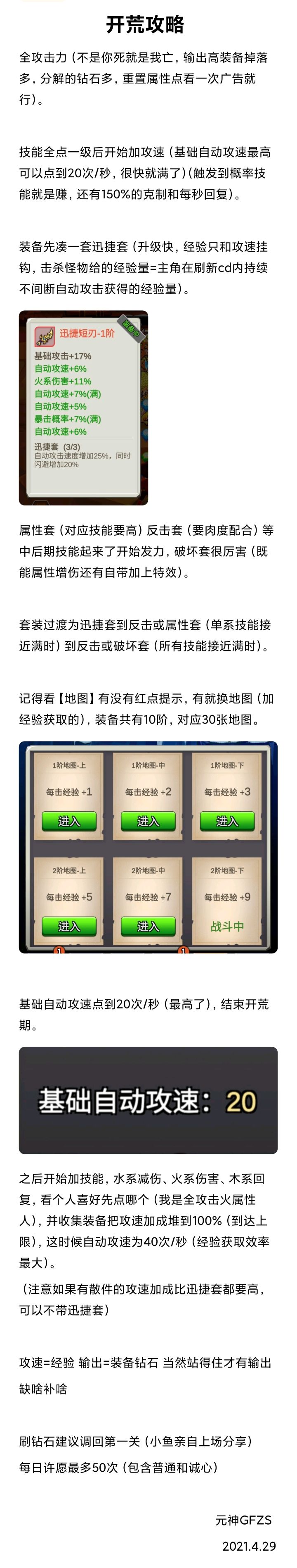 一:加点前期全攻击,后面看扛不住选择性加血二:关于前期看视频钻石使用在前期看视频(许愿),是选择诚心许愿(视频),还是基础奖励都是添加主角界面的攻击速度(目前最高20毕业)后期自然是选择加技能了三:关于技能添加选项(优先)首先除去大招不算一共可添加技能是16个 (大招我也不知道是啥,因为要点满所有技能才能出来)有的人说应该添加最下面那排增加回血,及增加普通攻击(技能)克制效果。有的