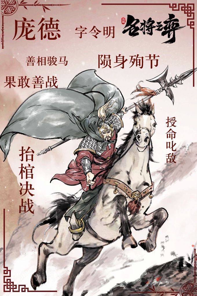 曾经的西羌一小卒,今日的魏国大将军。这就是我们本期武将日志的主角,庞令明。卷一:人物志庞德,字令明,原为马腾麾下武将,在随马腾四处征战的过程中屡立战功,勇冠三军。马腾被曹操征为卫尉后,庞德归属马超。马超兵败后,庞德随其一起投靠汉中张鲁,而后马超归降刘备,庞德仍留在张鲁麾下,曹操平定汉中后,庞德归降于曹操麾下。【单骑突围】渭南之战时,曹操被西凉军打败,马超与庞德、马岱引军进击捉曹操。马超被接