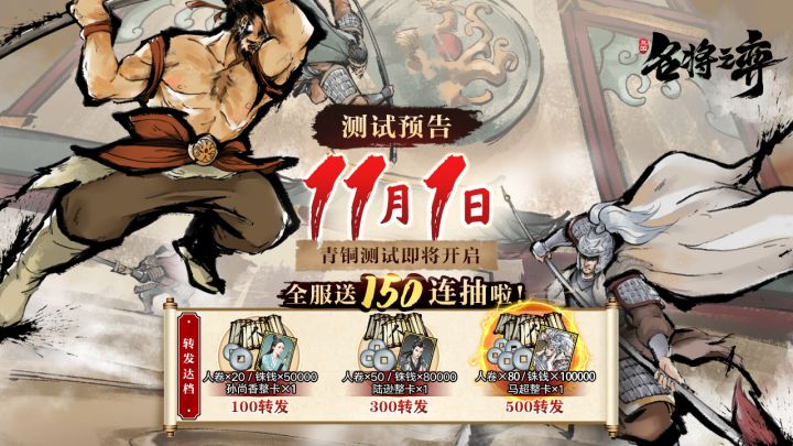 名将测试时已至,深秋时节又逢君。许久未见,甚是想念~香香给主公们带来了一个重磅消息:“青铜测试”正式定档11月1日!(本次测试为安卓不限量删档不计费,IOS端本次不参与测试,想体验的主公可以使用PC端的模拟器哦)为了庆祝即将与主公们重逢,作为福利官的香香本次测试也为主公们带来了惊喜福利。主公们只需动动小手点击转发本帖,便有机会获得150抽和超多福利哦~【活动奖励】转发数量到达:10