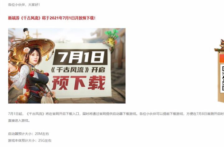 7月1日起,《千古风流》将在官网开启下载入口,届时将通过官网提供启动器下载游戏。启动器预计大小:20M左右游戏本体预计大小:25G左右游戏有25个g,可玩的内容应该不少,期待。