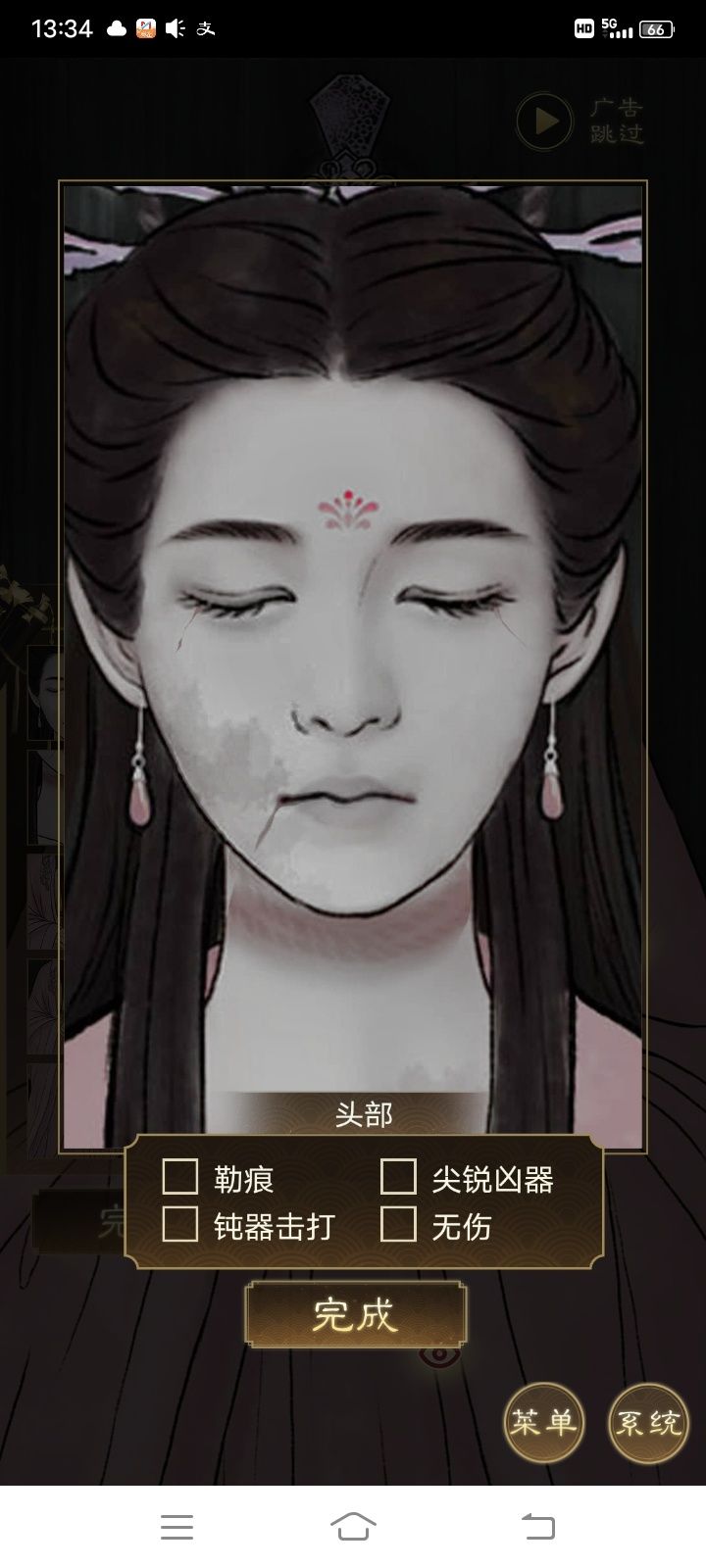 已通关,难度比较低,线索很容易找全,推理也十分明显,验尸小游戏可以不断试错无惩罚1-7关指认真凶前存档,分别指认每关的三个嫌疑人即可得到三个不同的分支结局第8关要复杂一点,着重说乱棍打死:第二天(初八)单独进皇后寝宫时未更换太监服以下皆需更换太监服死无对证:指认李副官为凶手皇室隐秘:指认方丈为凶手以下皆需指认倪大人为凶手满盘皆输:选择让庞将军监视,全盘托出无人生还:选择让庞将军监