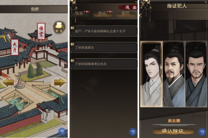 哈喽,大家好,我们是Muccy Games。很高兴告诉大家,《少年宋慈》很快就和大家见面啦!让我带领各位侦探们再来熟悉下流程吧。探索场景,找寻关键线索在《少年宋慈》中,玩家将在大地图中自由探索,找寻场景中的关键的物证线索,并根据这些线索进行推理锁定嫌疑人。询问证人,击溃心理防线在寻找到地图场景的线索后,玩家会发现场景里存在npc,尝试点击npc的头像,便可询问这些npc,但是不是每个npc