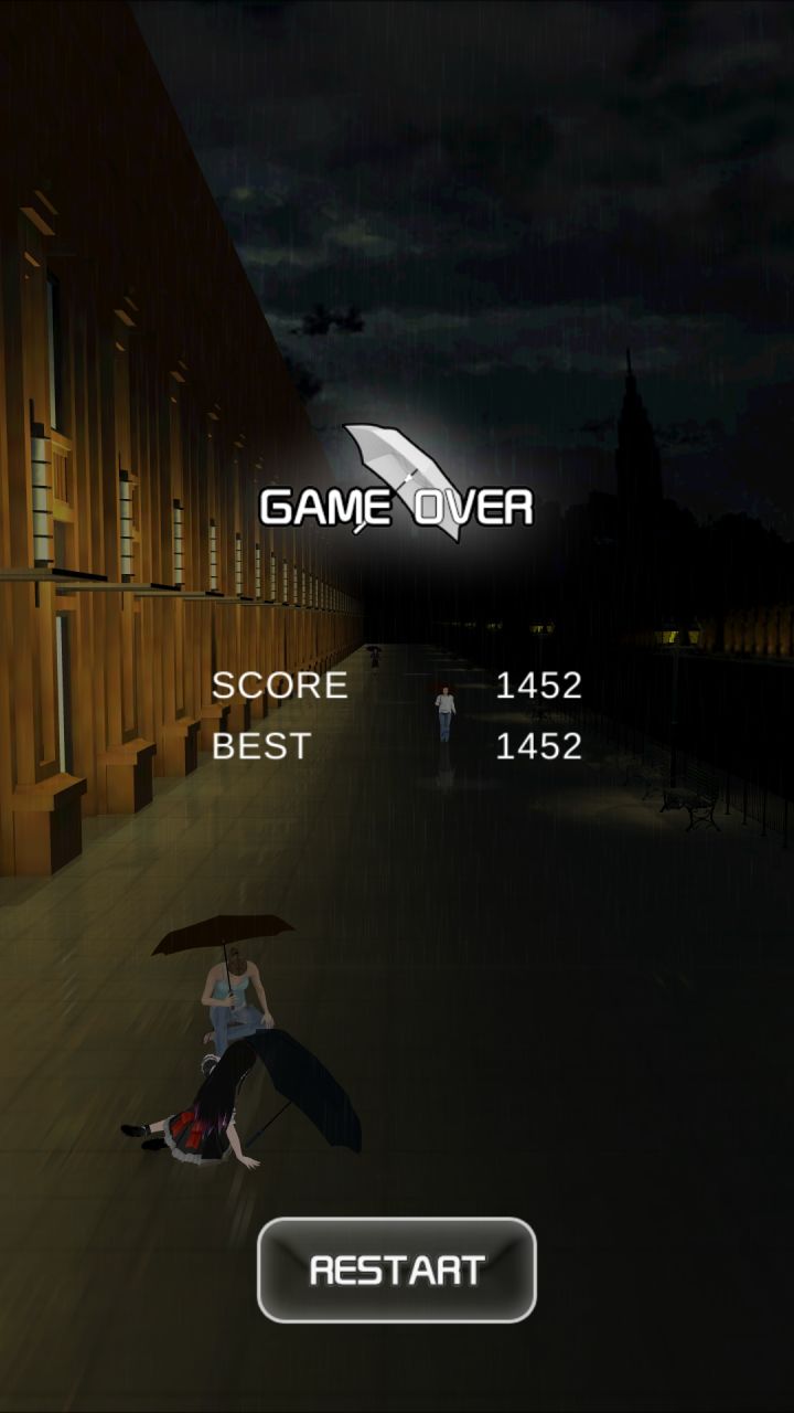 闲的没事玩了几分钟。整体比较单调,游戏似乎目前只有漫无目的的向前跑。无穷无尽,永不停歇。(人话:没有其他剧情了)道具玩到现在只有一个RUN,无非人物就是跑快一点。NPC建模也比较普通。场景也比较单一,实机角色看背面倒是挺可爱的。不过下雨声以及人物的脚步声对于很多人来说挺治愈的,音乐也能使人放松。(不过我咋觉得挺伤感的,有一种无助孤寂的绝望)如果此作品是作者大大是初次尝试的话,是个很大的