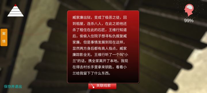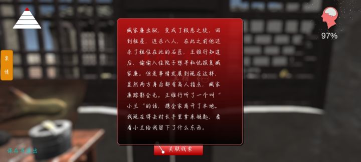 【游戏玩法】这个我就只能发表一下我的看法,首先场景内物品很多,绝大部分可以搜证,虽然增加自由度,也一定程度上很大提高了难度。剧情引导度不太够(不知道是不是这系列没玩的缘故),导致线索关联不起来,我无法判断是几个线索相连或者说是哪两个线索相连,太泛了。以及通过剧情我很难理解下一步我要做什么,感觉引导性可以加强,要是不失难度的情况也可以适当做出些提示性的改动,以防像跟我一样的这类型的小白进行不下去…