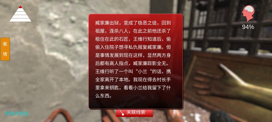 94%就过了,关键是开灯在木板上的字“我要找到凶手”,然后问南河得到臧家廉,中间不需要开其他门只要开柜子拿书点两次有两个线索,柜子钥匙在年画最上面的墙头,先关联出木匠王维行才有钥匙