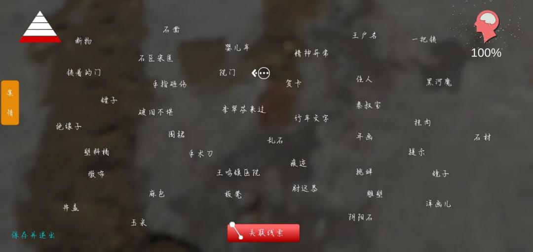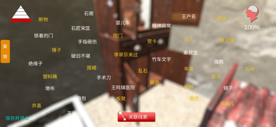 应该是最后的末班车了吧 没有高能 除了石匠的屋子门旁边藏着的断手 不是很吓人 可以点开的东西一般都是能移动的 包括断手 大拇指处的砸伤 然后通过南河的回答获取“中邪” 音乐听着有点吓人😂 我全程闭着音乐 还是建议把屏幕调暗点 关联线索是真的费眼睛 关联线索建议去看楼下21年解说的神仙劳斯 1.钥匙在通过南河的对话获取木匠王维行以后出现在壁画的墙上 是木匠屋子里的柜子上的锁 里面有三个线索 分别是留言1、2 和一张画 没事多点南河 一些重点线索都来自南河 南河的对话应该是通过破解的脑力来发生 2.进门的婴儿车上最前面有一行文字 3.塑料桶里面有一把手术刀 在脑力里面看手术刀 尾部有王鸣镇医院几个字 4.壁画的左下有血迹 是可以点的 5.灯在木匠的屋顶 拉灯的按钮在门旁边有一个红色的小线 拉灯后空木板上会出现我要找到凶手 6.空木板的旁边的树:皓灵道人 7.刚进门向前走的墙角里面有墩布 8.石匠门口的石头上有挑衅 9.贺卡在婴儿车旁边的土堆 10.绝缘子在破旧不堪的墙上最顶端 卡在99%的宝子如果是塑料桶没有点到 可以靠近刚进来的大门 然后点击塑料桶 祝各位游戏愉快!