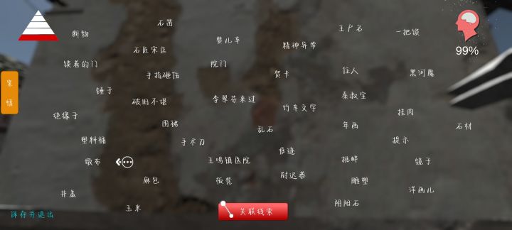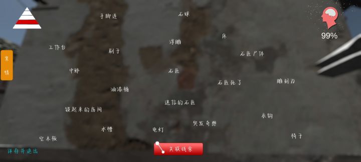 1.竹车文字,在婴儿车的右扶手2.绝缘子在进门抬头,右边老式那种绝缘子,白色的3.塑料桶里有手术刀,需要放大看4.还是主要和工具人通话,都是关键信息5.李翠芬来过是:婴儿车+竹车文字+精神异常6.手指砸伤是,点击断手(断手在石板后面,无高能)然后旋转就能看到发紫的手指7.石匠是凿子+石材+乱石+围裙+板凳+锤子+阴阳石1.乱石对面那个房间可以打开,进门前右手边有一把锁2.东西都在桌