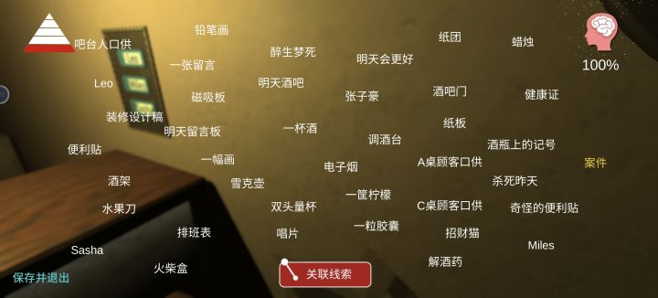 铅笔画:很明显画的一个高脚杯,杯里有两个x,还有一个小小的横线,X_X大概这样;杯右上方有一个胶囊或者药片;左下角是一串数字,大概是21536?看不很清楚。吧台人口供线索内容明显不对劲,怀疑是bug,但内容很有意思,应该是一个便签本线索,猜测有一个便签本线索大家都没找到,可能是二层或者四层?怀疑是第二层唯一缺失的那个,论坛有个兄弟说那个线索是“酒有问题”,但没给出公式,所以暂时存疑。