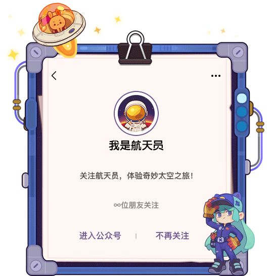 开奖啦!请获奖的幸运儿在7天内添加Q群859350904联系管理员领取奖励,逾期视为放弃~ ============================= 各位航天员们大家久等了啦! 9月的关注抽奖活动如期而至哦~ 这次不同的是,关注《我是航天员》官方公众号才可以参与活动! 《我是航天员》正在火热预约中,提前关注公众号可以快人一步获取更多游戏最新资讯,小嫦和小羿在公众号已经等候多时了~ 话不多说,快来