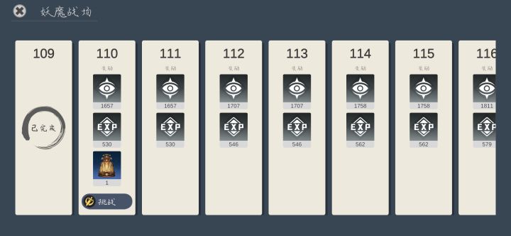 目前52级没果子妖魔战场应该做出调整,奖励最好的不过是经验,法宝根本没用了,还是说我太垃圾了,打不动110层另外,有没有人抽出无冷却的技能,我只有这个蓝色的心法后面我只抽到过最中间的,但是旁边四个死活没出其他的