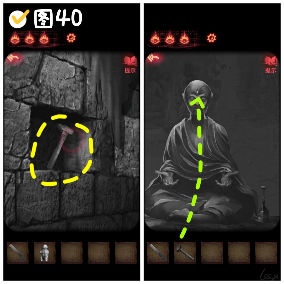 ✔第四章·断丝✔ *梁少平视角* 37.走完剧情自动获得〔铜尺〕。男童上方拿走砖头获得〔锤子〕。用锤子砸石像的头,获得〔圆宝石〕。(图40) 38.完成藏经阁左侧墙上的拼图,如图,石板翻面,卡住了,使用锤子,获得提示。(图41) 39.根据拼图处提示“五-三-四-一-四”,结合金童玉女前桌子上书籍的第二页石门上石块的编号,按顺序点击对应石块,石门打开。(图42) 40.进入工坊,工坊左侧柜