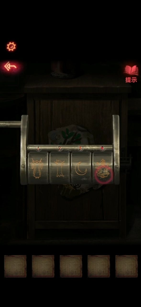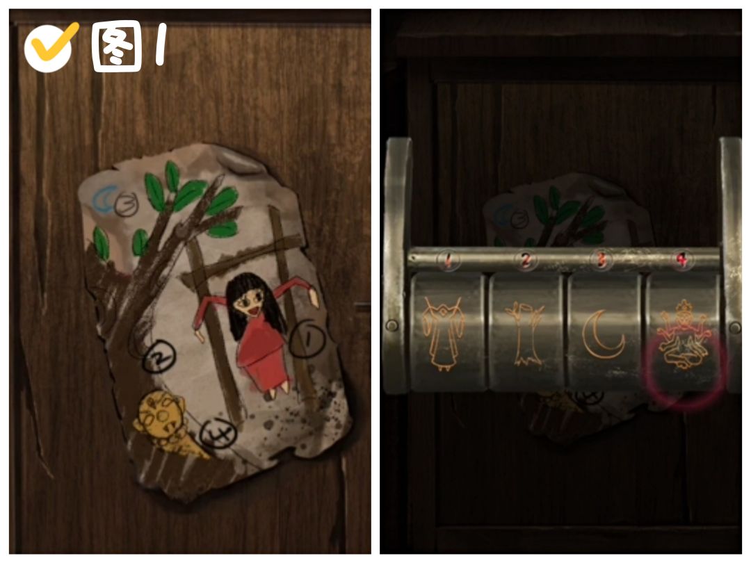 第一章 1、柜门上,根据画上的编号对应的图案,打开锁拿到【枣糕 】。 1.衣服 2.树 3.月亮 4.佛像 2、脸盆里拿到【湿日记本】,左边抽屉里拿到【干玉米棒】,用桌上的蜡烛点燃。  3、梯子上拿到【煤炭】,点击梯子上的布,再点击梯子移动到中间,点击天花上的铃铛。  4、根据铃铛上的符号和高低位置,解开抽屉的锁,拿到【胶布】。 高度:3142 5、用【胶布】修好电视电源线,插上插头,打开