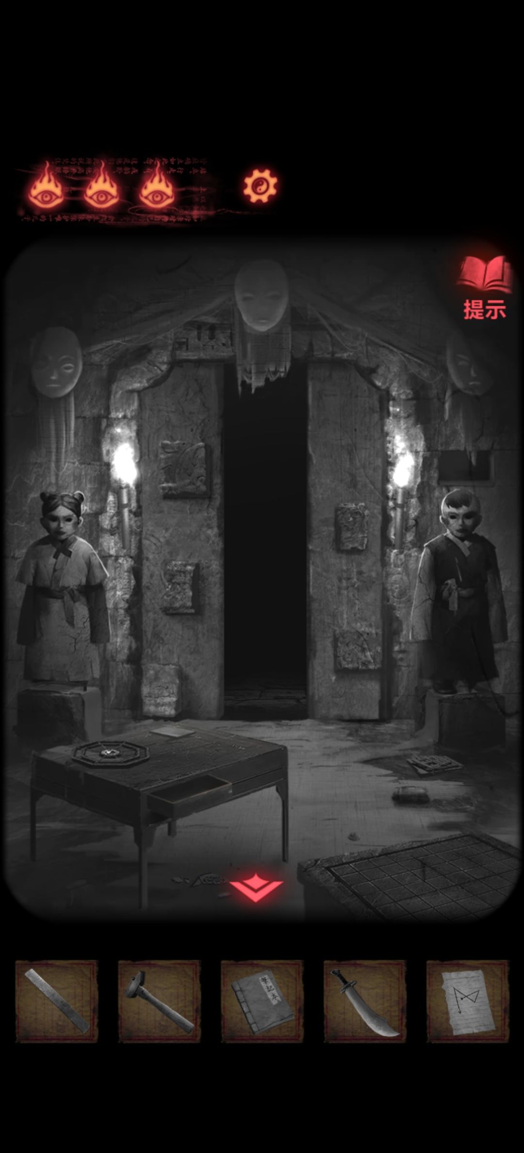 剧情后面对着一个黑白的世界,别担心手机没坏,你看提示还是红的嘛~开局自带铜尺一把,在之前用硬纸板撬墙的地方拿到锤子,左边桌子上八卦算盘暂时没线索不用管。 算盘旁边书看一下,提示男童黑衣女童白衣先黑后白,这就是一会右边棋盘下法了。 第二页有个一二三四五掏出小本本记下来,其实没有小本本就按照从上到下12345就行了。。也不怎么用记的样子。 来右下棋盘开始下棋,先下白色吃掉黑色,再下黑色吃掉白色,然后白