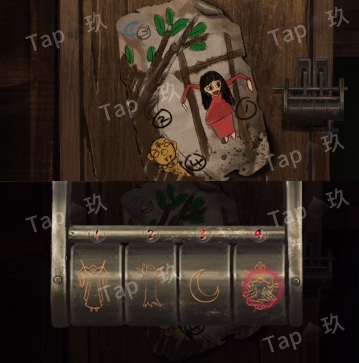 第一章1、柜门上,根据画上的编号对应的图案,打开锁拿到【枣糕 】。1.衣服 2.树 3.月亮 4.佛像2、脸盆里拿到【湿日记本】,左边抽屉里拿到【干玉米棒】,用桌上的蜡烛点燃。3、梯子上拿到【煤炭】,点击梯子上的布,再点击梯子移动到中间,点击天花上的铃铛。4、根据铃铛上的符号和高低位置,解开抽屉的锁,拿到【胶布】。高度:31425、用【胶布】修好电视电源线,插上插头,打开