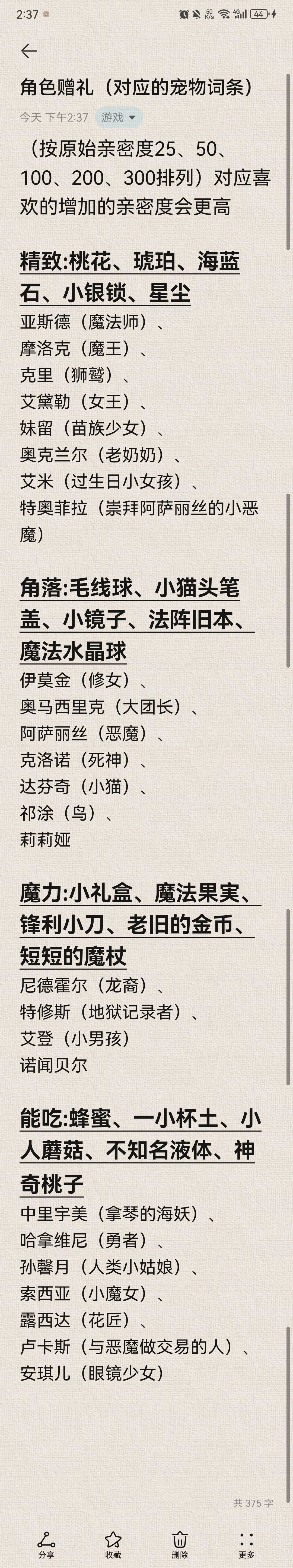 🍀由于煮波还没有友情池里面的sr,所以不知道他喜欢什么,有知道的店长可以评论补充一下[表情_开心] 🍀大家可以让宠物找你要升的角色喜欢的礼物词条,加的好感度会多一些[表情_酷] ————————分割线———————— (按原始亲密度25、50、100、200、300排列)对应喜欢的增加的亲密度会更高 📌精致:桃花🌸、琥珀、海蓝石、小银锁🔒、星尘🌌 亚斯德(魔法师)、 摩洛克(魔王)、 克里(狮鹫)
