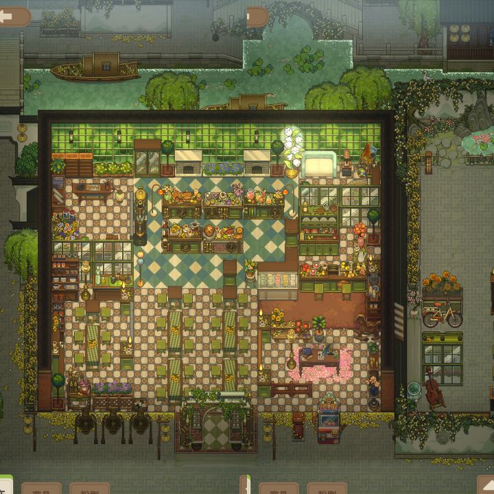 #咖啡馆的独特设计 入坑很大一部分就是被花梦还有水乡景簿吸引住,他们两个也是搭的不行,尤其是绿色的窗户壁纸好像映着水乡的水光。户外大堂以我仅存的家具还没什么灵感,就先装成这样了,真的很努力的在抽各种家具来冥思苦想的搭配()