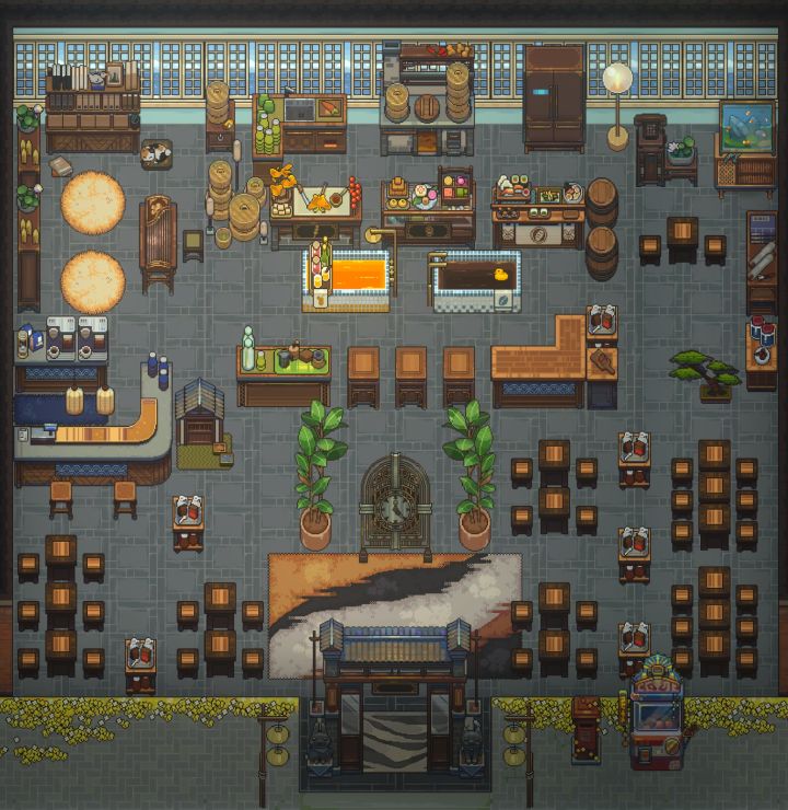 服务台工作面积高重复度的对称密铺(强迫症狂喜),除了几乎不会有客人的左上角和右上吧台,每张桌子都至少有两个服务员可以到达,减轻一点练度压力(20-30级就可以上班),同时也能让传菜工少跑点路