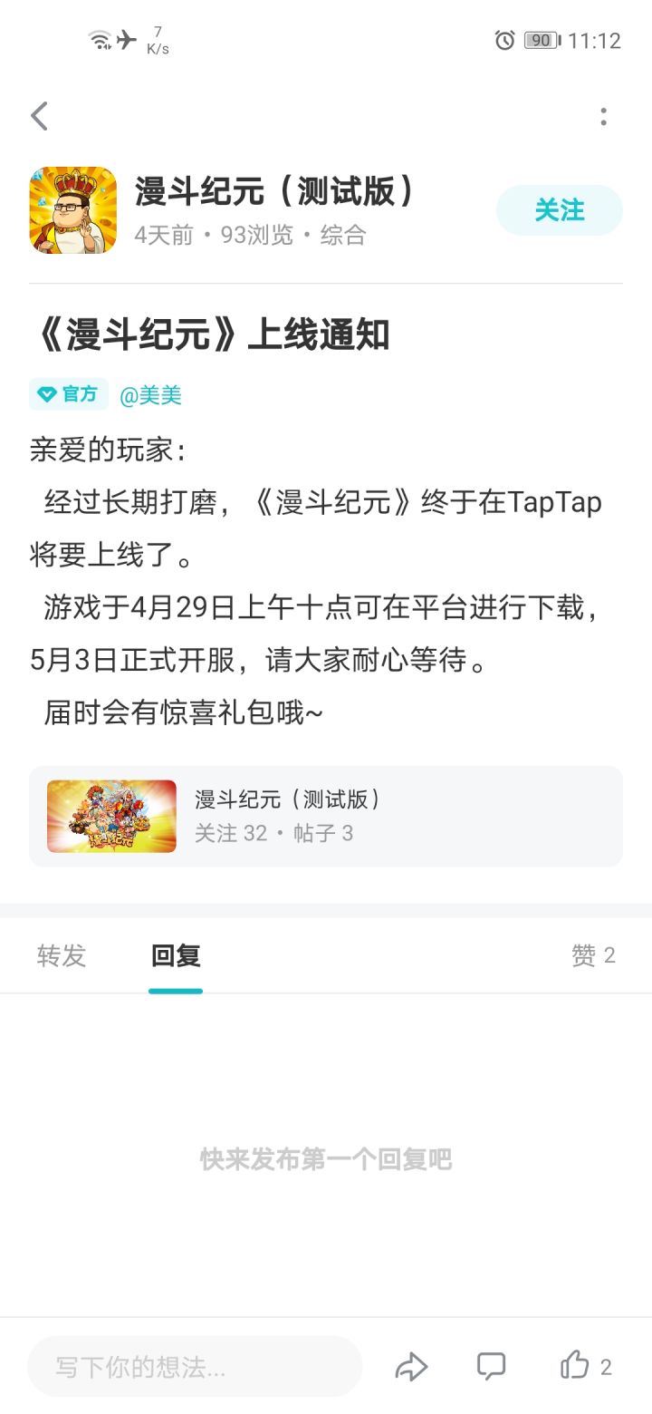 亲爱的玩家:经过长期打磨,《漫斗纪元》终于在TapTap将要上线了。游戏于4月29日上午十点可在平台进行下载,5月3日正式开服,请大家耐心等待。届时会有惊喜礼包哦~
