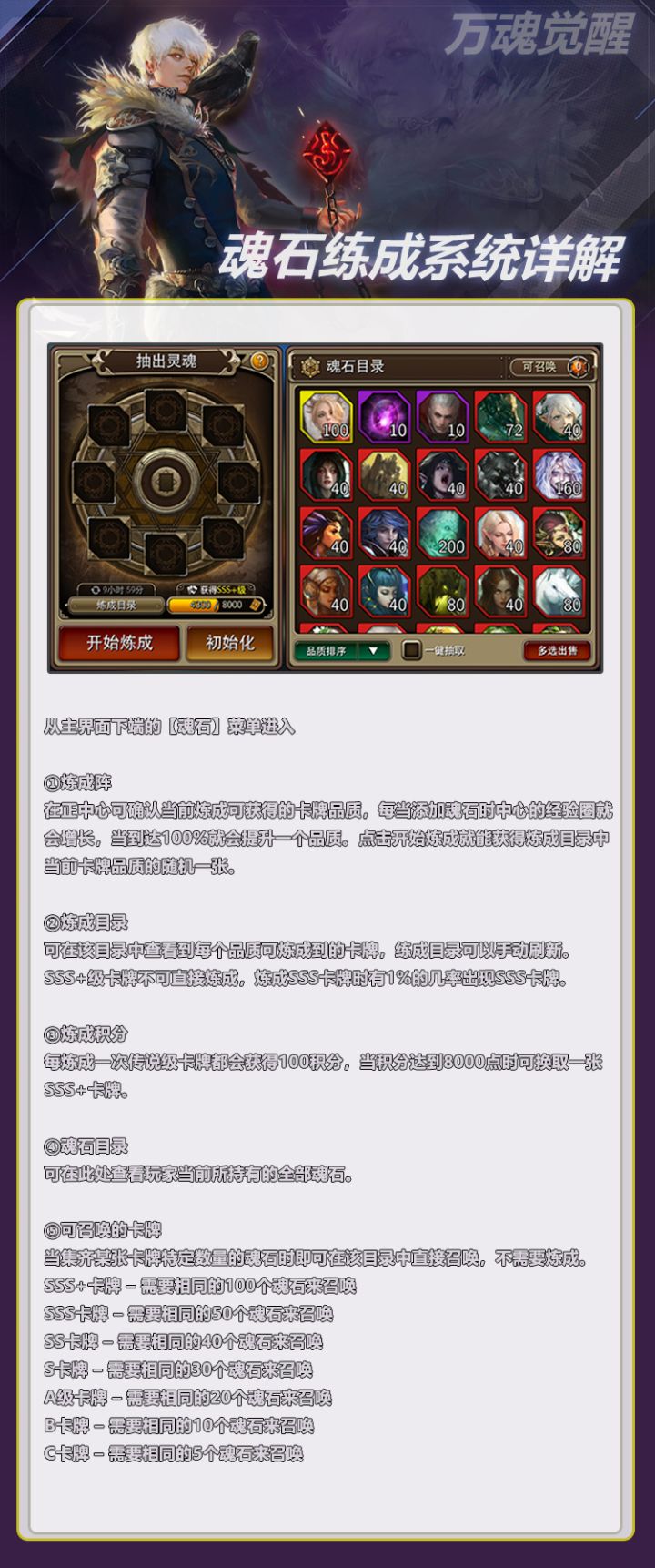 【魂石练成】详解图该系统是玩家获得卡牌的重要途径,使用收集的魂石或分解不需要的卡牌,获得魂石,可随机获得炼成目录中的其中一张卡牌。或通过练成目录刷新出喜欢的卡牌进行练成获得;诺亚小提示:请勿盲目分解卡牌哦~