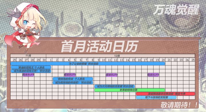 【万魂觉醒】首月活动日历!各位冒险家们感恩节快乐!这寒冷的天气,小甘已经穿着袄子在搬砖了,各位冒险家们居住的城市温度如何呢,大家有没有穿上厚厚的棉袄呢?小甘今天也为各位准备了周末小礼【兑换码:WHJX666】,冒险家们可以通过游戏内【主界面>设置>兑换码】领取奖励~另外为各位冒险家们附上首月活动日历!期间小甘也会不定时为各位准备小礼哒~