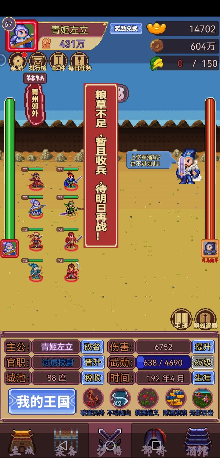 给新手玩家的建议:前期装备可能比将领升星更有价值,将领升星废的资源太多了。对某些将领,另外一套好的装备可能比一套套装的效果更好。