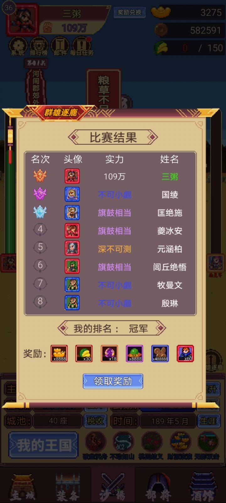 第2天: 109万战力拿了群雄逐鹿冠军,领到8888的元宝真香,随机碎片给了60曹操,正好是阵容需要的,真香!!! 当天升到138万战力,自己44级所有武将49级。手欠抽了波爱心,不然自己45级,武将50级可以直接换50级套装了。在上阵一个武将,战力本来预计今天可以160万……解锁了第8个武将位置,懒得放了。等明天有元宝了抽一波武将,抽到需要的正好上阵。50级的石头都锻造完了,就等明天一有体