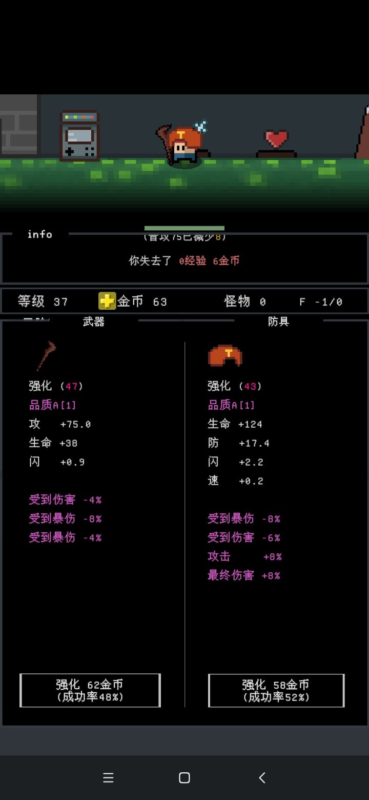我怀疑这游戏就是骗看广告的,所有关卡爆率一致,要刷好装备就只能关卡1,最后的装备就只能紫色,只能装备2件装备,装备就只能强化加属性,抽奖(垃圾)就只能靠抽100次才能抽出紫色,其他装备没啥用,如果没紫色装备,打怪都费劲,就算有紫色装备还得看广告买金币强化装备,更废的是人物升级只能选择一种属性点,而且就真的就一点属性,而且加点生命一点作用没有,稍微有作用的就是攻击,护甲前中期真的一点作用都没用,后期怪护甲真高,点攻击作用不大,点护甲攻击又低,然后就是看广告复活,或者无限100金币买复活,说白了就是要你看广告。
